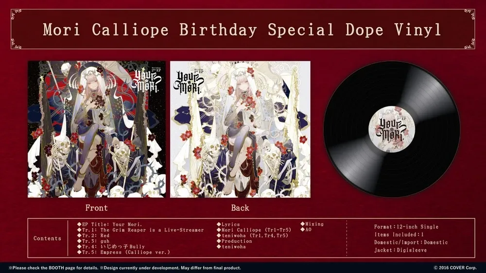 誕生日記念プレミアムグッズセット2021(グッズ全部セット) 〈商品説明〉 特典ボイス付きの誕生日記念グッズ全部セットです。 価格:14,444円 〈セット内容〉 ◇記念グッズ4種セット ・森カリオペ Special Dope Vinyl 誕生日記念レコード (フォーマット:12インチシングルレコード 構成数:1 国内/輸入:国内 ジャケット:E式) 作品タイトル『Your Mori.』 Tr.1『The Grim Reaper is a Live-Streamer』 Tr.2『Red』 Tr.3『guh』 Tr.4『いじめっ子Bully』 Tr.5『Empress (Calliope ver.)』 Words Mori Calliope (Tr1-Tr5) てにをは(Tr1,Tr4,Tr5) Total Produce てにをは Total Mix AO ・Rei先生描き下ろし SICK EP ポスター (サイズ:約H910 × W610mm 素材:紙) ・Rei先生描き下ろし Hella-Official 死神缶バッジ3種セット (サイズ:各 直径約75mm/直径約56mm/直径約32mm 素材:紙・ブリキ) ・SARUEI先生描き下ろし "Cash-Money" 死神抱き枕カバー (サイズ:約H1600 × W500mm 素材:ポリエステル 2WAY) 〈購入特典〉 こちらのセットを購入すると以下の特典が付属します。 ★特典:森カリオペ Dope 誕生日記念特典ボイス ※既定の生産数量に達し次第、受注を締め切らせて頂く場合がございます。予めご了承下さい。